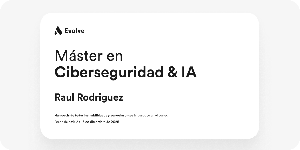 Al finalizar el máster, obtendrás una certificación que acredita tus competencias en Ciberseguridad & Inteligencia Artificial, respaldada por Evolve Academy